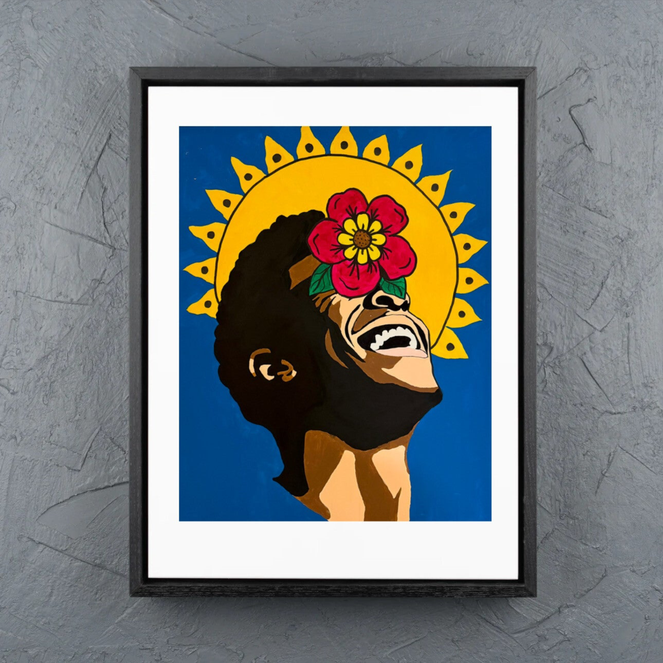 With bold colors and expressive lines, the work channels themes of Black joy, resilience, and the sacredness of self-expression. The flower, blooming from the face, symbolizes how beauty, creativity, and healing emerge from the act of being fully present in one’s truth.